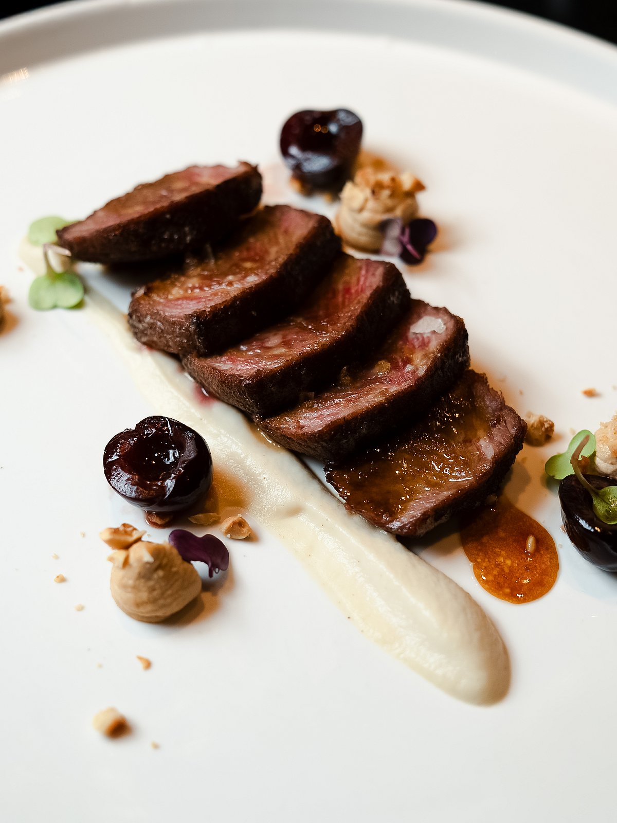 The 'Secondo Piatto' offered a choice between a seared Farm Raised Chicken Breast with an orange-ginger–thyme sauce or a Pan-Seared Lamb Rack. The sliced lamb arrived on a bed of lamb reduction enriched with soy sauce, which added a subtle tang to the seared meat. It was paired with a hazelnut purée, cauliflower cream, and confit cherries. “This draws inspiration from Calabrian tradition, where bold, intense flavours are paired with simple, fresh ingredients from both the coast and mountains,” says the chef. “Hazelnuts reflect the region’s nut-growing heritage, the cherry brings natural sweetness, and the cauliflower offers a gentle, earthy counterpoint.”